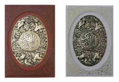 - القرآن الکریم سفید / قهوه ای عروس (وزیری پلاک طلایی گل مرغ قاب کشویی . یاقوت کویر)